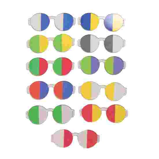 Neuro training glasses for targeted colour and light therapy to treat each brain hemisphere individually. Can be worn on both sides. The set includes: 11 two-tone glasses in the colour combinations green/blue, blue/transparent, red/transparent, red/blue, red/green, green/transparent, yellow/green, yellow/transparent, red/yellow, blue/yellow and grey/transparent.