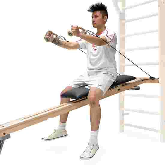Can be hooked into the wall bars at any height. Also suitable for leg training when used vertically and with its feet retracted. Compact storage. Silent cable pulley with ball-bearing rollers. Real leather upholstery. LxW: approx. 190×60 cm. Bench (LxW): 85×35 cm. Max. load: 120 kg. 19 kg.