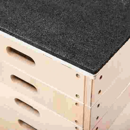 The jump strength trainer from Sport-Thieme is ideally suited to plyometric training in athletics (high jump, long jump etc.), in basketball and volleyball training or in fitness. Thanks to the high stability and sturdiness, the boxes are ideal for carrying out clean and safe exercises. There is an anti-slip covering of Regupol on the upper surface of the box, so training jumping strength in spikes is also possible.