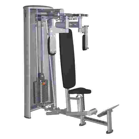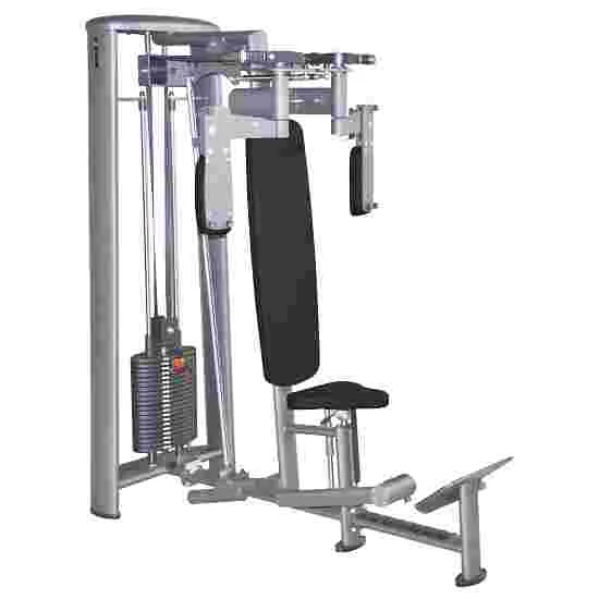 The Sport-Thieme “OV” butterfly machine is equipped with a 100-kg weight stack. Thanks to a special locking pin, the weights can easily be adjusted in 5-kg increments – making the butterfly machine perfect for every fitness level. The legs are also equipped with rubber buffers for stability. The padding on the seat, backrests and armrests also ensures a high level of comfort during training. The machine is available with or without metal cladding behind the weight stacks. Butterfly exercises are especially suitable for strengthening your chest muscles, but also work the deltoids.